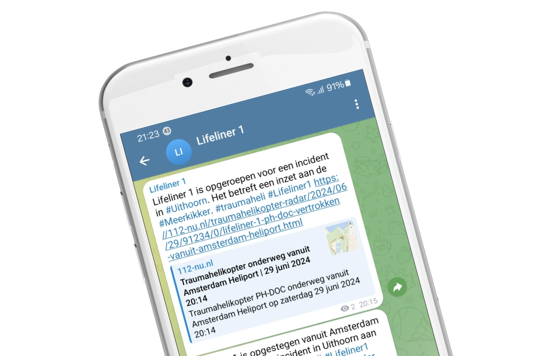 We have a dedicated Telegram channel for each air ambulance in the Netherlands. When an air ambulance is called out, takes off, or lands, we immediately post a notification in the relevant Telegram channel. This way, you're always informed about the current flights of air ambulance helicopters in your area or of interest to you.